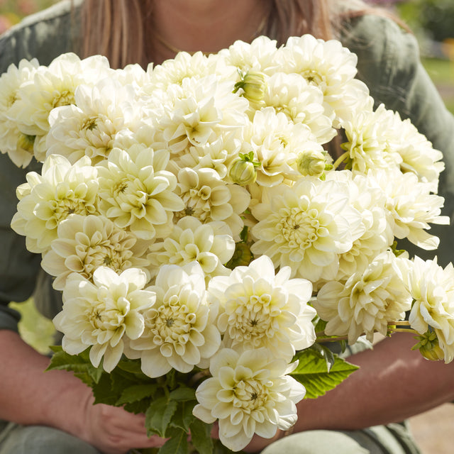Løgbutikken.dk Dahlia 'Caramel Antique' Dekorativ, Smuk Cremet Hvid med snert af sart gul. Dahlia, en af de smukkeste blomster i haven og blomstrer indtil frost.