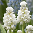 Løgbutikken Perlehyacinter/Muscari azureum 'Album' Usædvanligt Smukke og yndige helt Sne-hvide blomster, flérårige under de rette forhold, kommer med masser af blomster, 10-15 Cm. høj, Marts-April, Solrigt & Veldrænet.