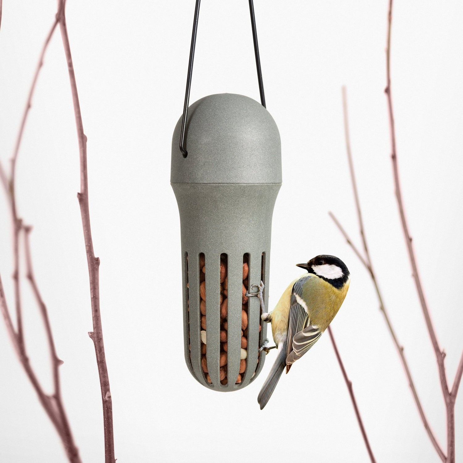 Derudover er designet minimalistisk og smukt, men også praktisk. Du fylder den med mad på et øjeblik og hænger den lige så nemt op fra et træ eller en altan med den medfølgende krog.